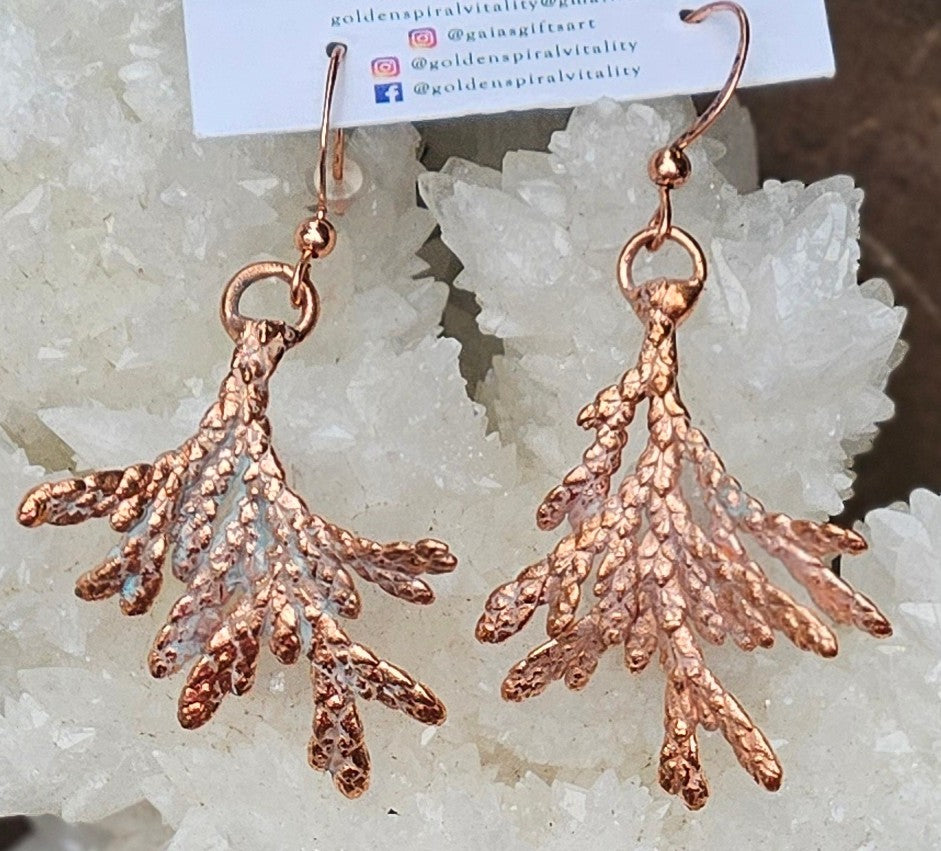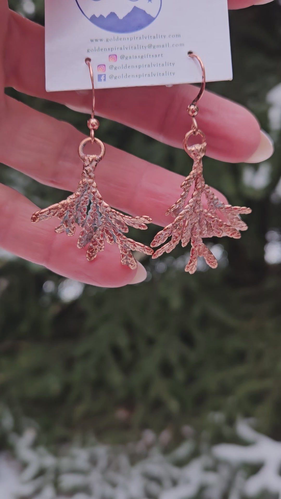 - Material: Real white cedar leaves electroformed in copper with hypoallergenic niobium ear hooks.